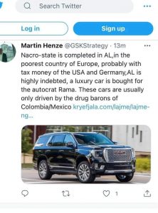 “Shqipëria u kompletua si shteti i narkotrafikut dhe vendi më i varfer në Europe. Me siguri Rama ka blere makinen luksoze me leket e taksave te Amerikës dhe Gjermanise. Kjo është një makinë që përdoret vetëm nga baronët e drogës ne Meksikë”.