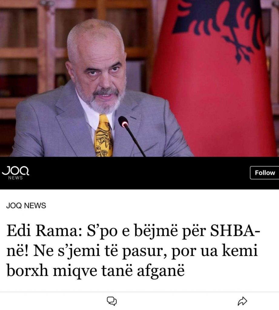 👉 Ndaj Rama tallet me gjithë dynjanë kur thotë se “NUK E BËJ PËR AMERIKËN POR MË DHIMBSEN AFGANËT”! Pra i dhimbsen këtij afganët, këtij që po i bën shqiptarëve atë që s’ia ka bërë as Enveri, as Serbi dhe as Greku!