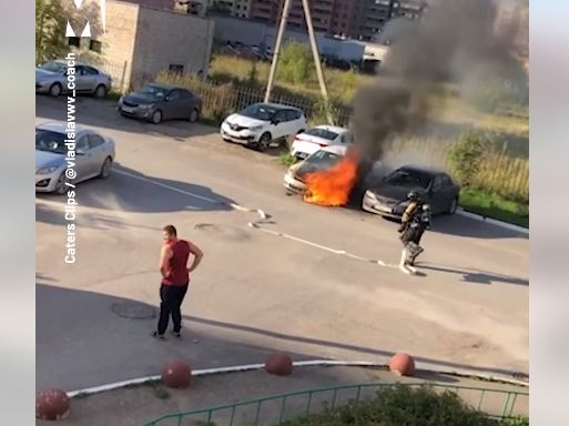 Metro ka publikuar një video ku shihet një zjarrfikës që mundohet ta ndalë zjarrin që kishte përfshirë një veturë në një parking. Por, i njëjti rrëzohet derisa bën përpjekje që ta drejtojë zorrën me ujë drejt automjetit që ishte në flakë. Atij më pas i dalin në ndihmë dy kolegët e tij.