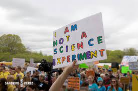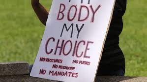 Protestuesit mbanin në duar pankarta me mbishrime anti-vaksine, duke thënë ′′ Trupi im, zgjedhja ime ′′ ose ′′ Shpëto Nju Jorkun, shpëto Amerikën “.