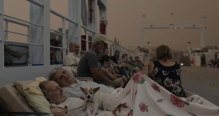 ”Georgios Liakos 89 vjeç dhe gruaja e tij Parisso Liakos 87 vjeç banorë të fshatit Pefki, po presin me qenin e tyre Bella, në kuvertën e trageteve e cila po pret në plazhin e fshatit për të ndihmuar në evakuimin e fshatit gjatë zjarrit në pyje në Veri. Evia, e Dielë 08 Gusht 2021 “ishte , përshkrimi i fotos që përmbledh në një fjali dramën e ditëve të fundit.