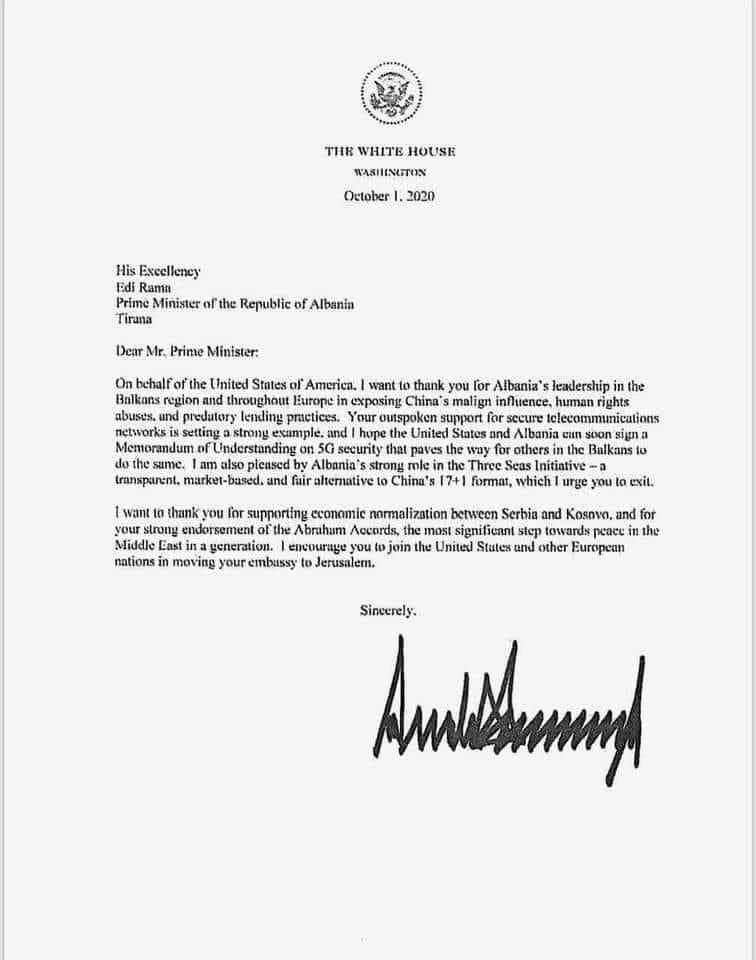 Diten e sotme Presidenti i SHBA -ve dergoi nje leter per Kryeministrin Edi Rama, ku midis te tjerave bien ne sy dy gjera, Shtetet e Bashkuara kanë përshëndetur qëndrimin e Shqipërisë lidhur me influencën e Kinës sa i përket përhapjes së rrjetit 5G në rajonin e Ballkanit Perëndimor.