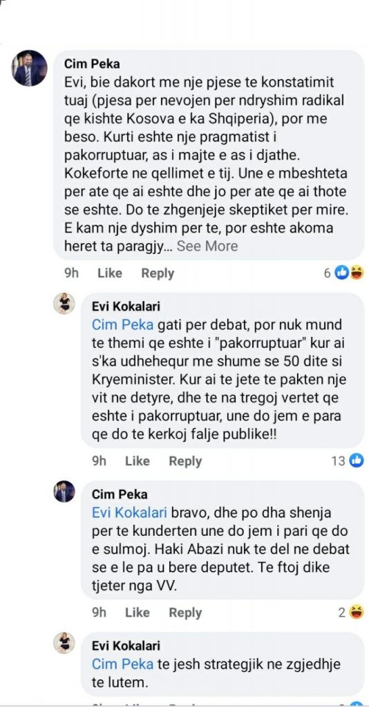 Evi Kokalari : “Cim Peka, fajin e keni ju të medias bashkë me Lulzim Basha e të tjerë, që u entuziasmuat në ekstazë për fitoren e Albinit Kurtit, thjeshtë sepse Kosova kishte nevojë për ndryshim radikal, ashtu sic ka nevojë dhe Shqiperia. Ndërkohë, anashkaluat faktin që Albin Kurti i përket një ideologjie që bie në kundërshtim të plotë si me parimet bazë të PD-se, ashtu dhe të Donald Trump, që ti e simpatizon. Me këtë entuziazëm, i bëtë dëm popullit që ju ndjek. Ndoshta keni influencuar plot vota në favor të Kurtit. Fajin mos ja vini Albinit, ai është i qartë në pikëpamjet e tij. Faji bie mbi ju të Shqipërise”.