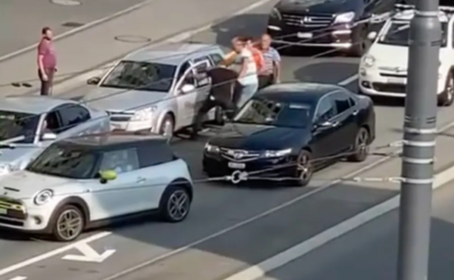 Tre burra rrethojnë serbin brenda në makinë në mes të rrugës, njëri i veshur krejtësisht me të zeza e rreh fort njëherë nga xhami i pasagjerit dhe njëherë nga xhami shoferit