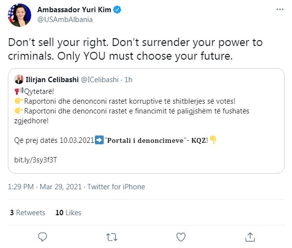 Ambasadorja amerikanë në Tiranë, Yuri Kim u ka bërë sërish thirrje qytetarëve për të mos shitur votën.